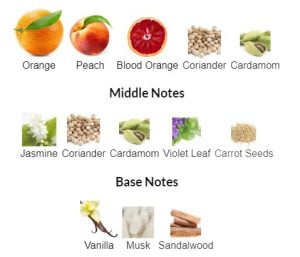 Връхните нотки са портокал, праскова, кървав портокал, кориандър и кардамон; средните нотки са жасмин, кориандър, кардамон, виолетови листа и семена от моркови; базовите нотки са ванилия, мускус и сандалово дърво.