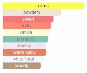 В този аромат има много освежаващи цитрусови плодове, особено червен портокал. Основа от ванилия, мускус и сандалово дърво придава на парфюма лека кремообразност, така че никога да не се усеща остър или тънък. Наистина ще ви хареса как балансира по-свежите нотки, без да ги затрупва. Друго нещо, което ще харесате в аромата, са свежите пикантни акценти на кардамон, кориандър и виолетови листа. Красива смес от зрял, мек портокал и изтънчен захарен памук, която не е завладяваща по никакъв начин. Пригответе се да се насладите на младостта си с този аромат. Това е забавен, момичешки, лек аромат, идеален за топли вечери.